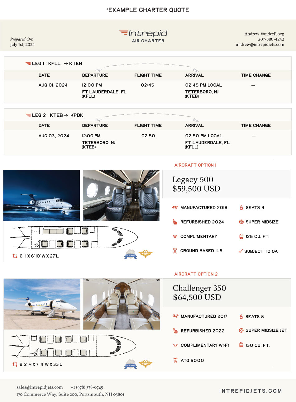 Once, IAC has gathered, assessed, and curated down to the few aircraft options that align with the trip requirements and budget, we provide the client a proposal with tail-specific aircraft options for consideration.